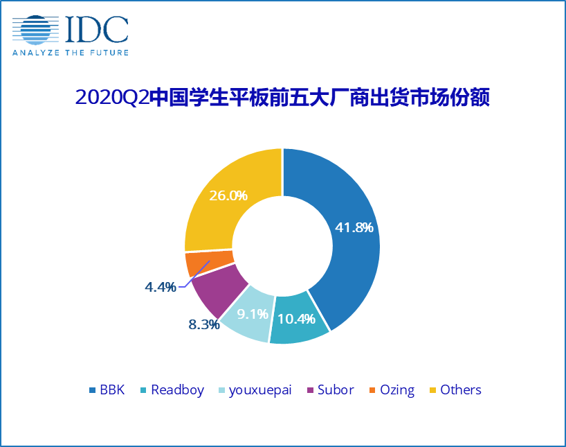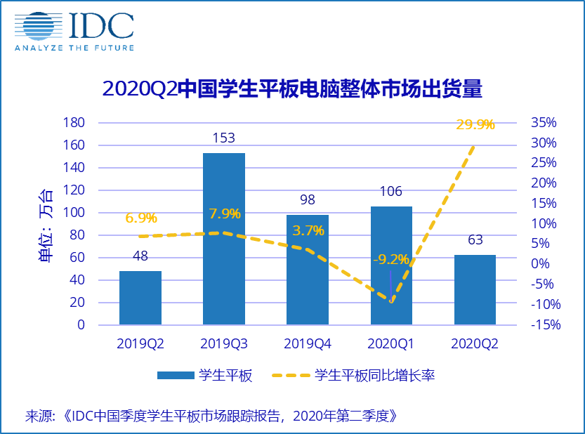 国际数据公司(IDC)最新发布的学生平板电脑季度跟踪报告显示:2020年第二季度中国学生平板电脑市场出货量约63万台,同比增长29.9%,增幅明显高于普通平板(17.7%)。疫情影响之下,在线教育风口正起,学生平板强势复苏。