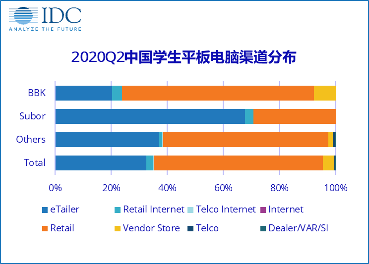 整体来看,学生平板市场目前以明星代言、广告投放和线下实体渠道的传统销售模式为主。其中以BBK为代表的传统学生平板厂商以商超/书店/专柜/专卖店等传统线下渠道为主,在疫情严重影响线下渠道的情况下依然占据近八成市场份额份额。以小霸王为代表的新兴学生平板厂商以及一些规模较小厂商由于策略和自身资源等原因选择以电商等线上渠道作为主要销售途径,部分小厂商还会覆盖运营商渠道。但是在此次疫情期间影响商超/书店等传统线下渠道,传统学生平板厂商也在加大线上渠道建设和投入,导致未来市场资源将向线上渠道倾斜,预计未来学生平板市场线上渠道份额会长期保持增长。
